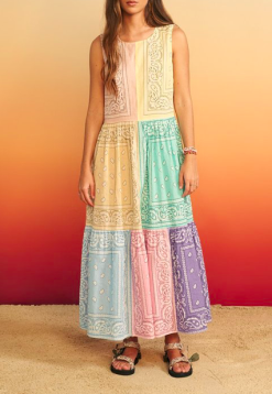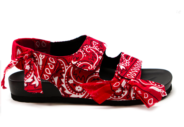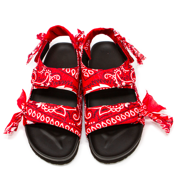 Sandales à grosses brides velcro habillées de bandana rouge.