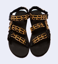 Sandales à brides habillées de tissus banana vintage noir et leopard.