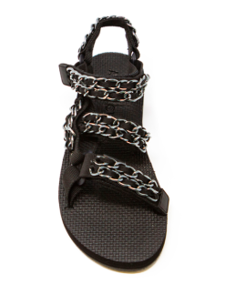 Sandales à brides velcro habillées de tissus zébré noir et blanc.