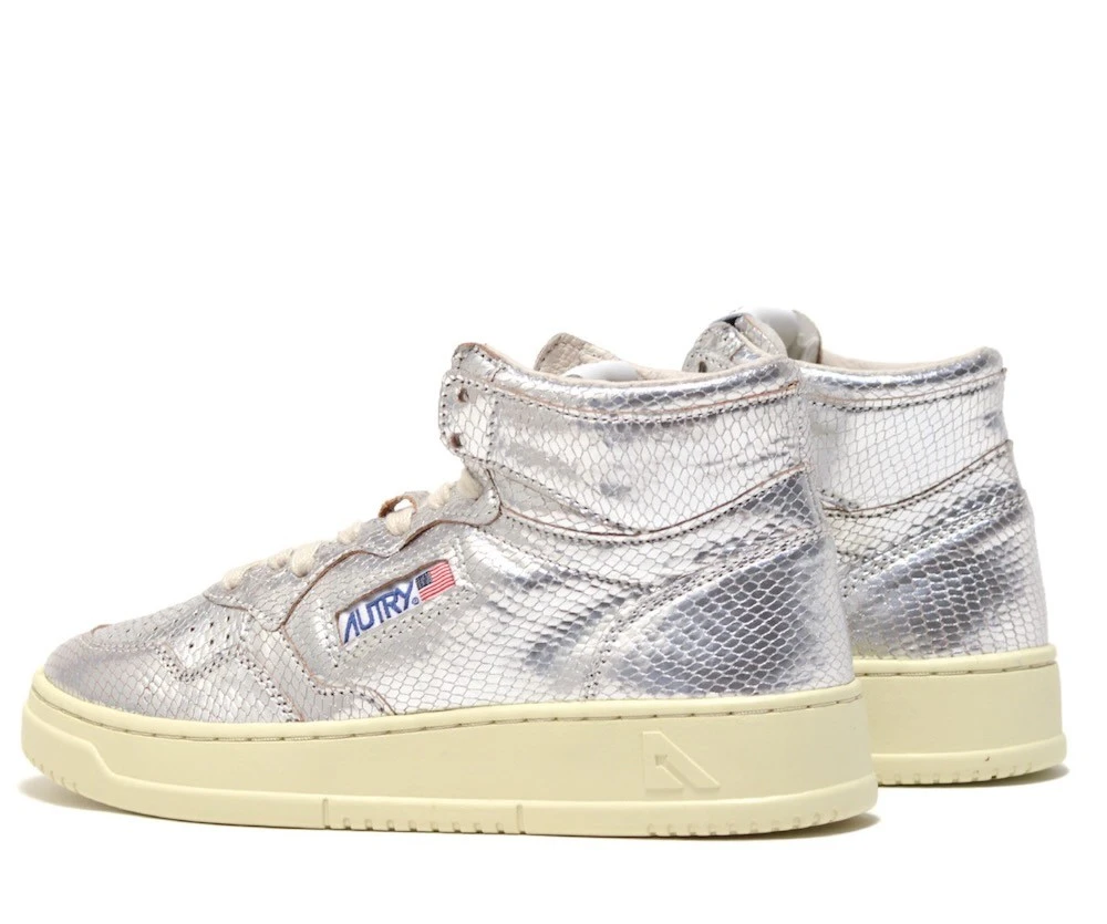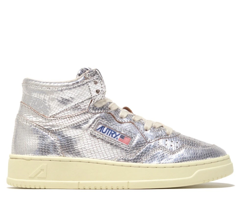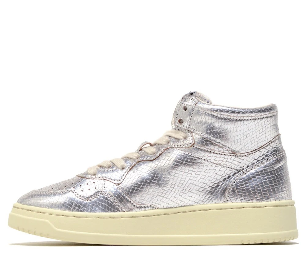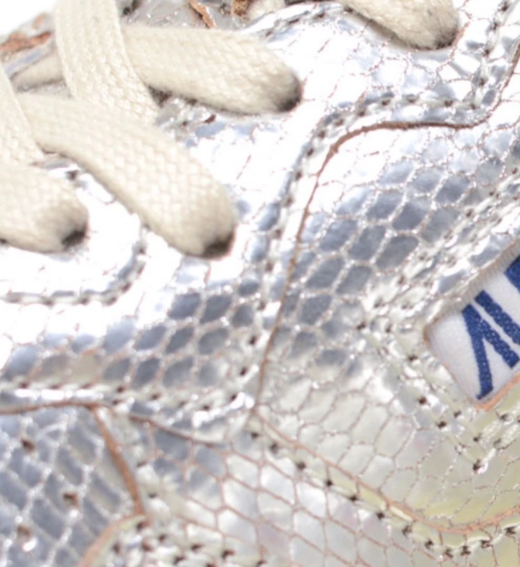 Baskets en cuir de chèvre effet reptile coloris argent.
