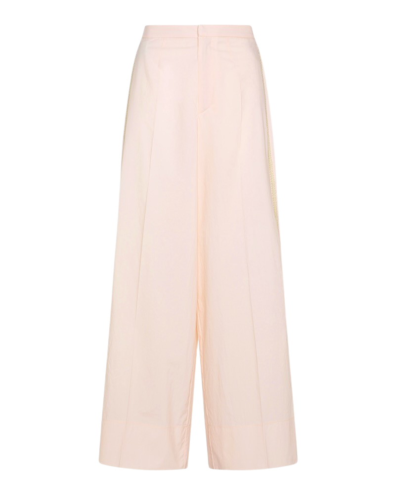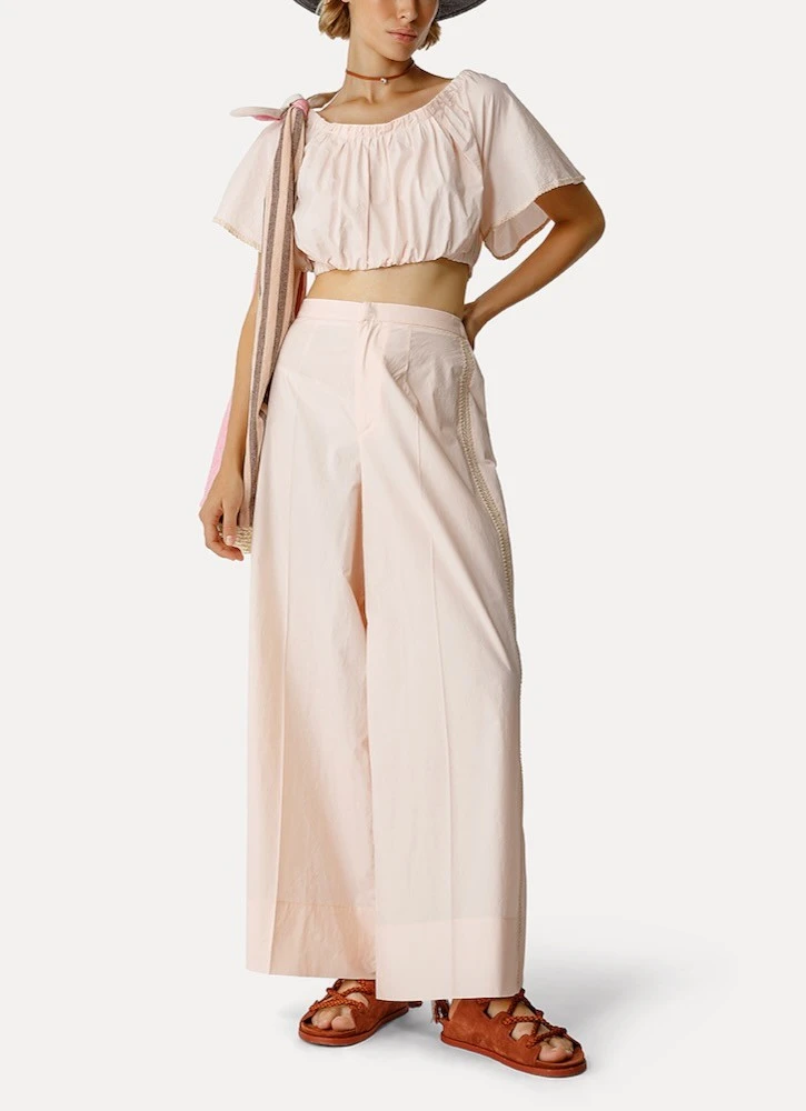 nouvelle forme de pantalon très ample et ajusté à la taille, coloris sugar, réalisé dans une belle ,popeline de pur coton.