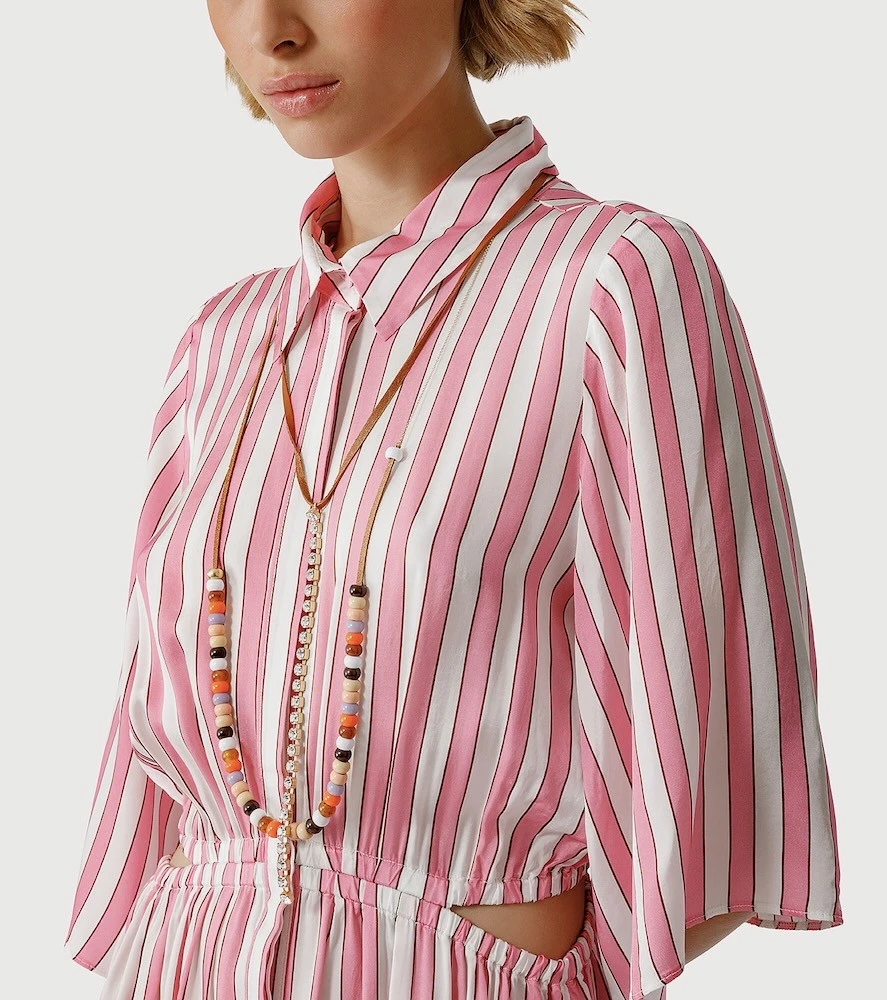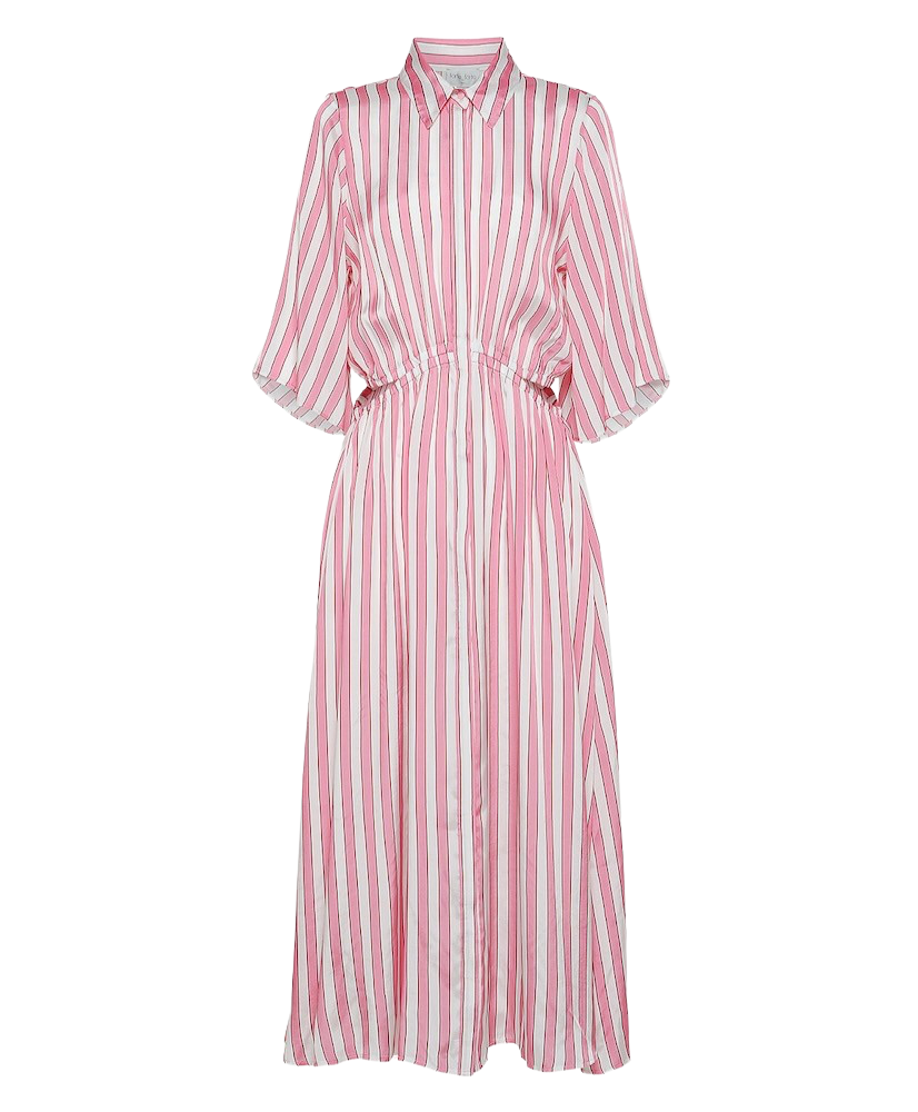 fluide, lumineuse et à l’humeur détendue : cette robe en satin à rayures interprète avec une légèreté estivale un grand classique de la garde–robe. les lignes sont déstructurées, avec de larges manches qui s’arrêtent au coude et une fronce délicate qui dessine le tour de taille.