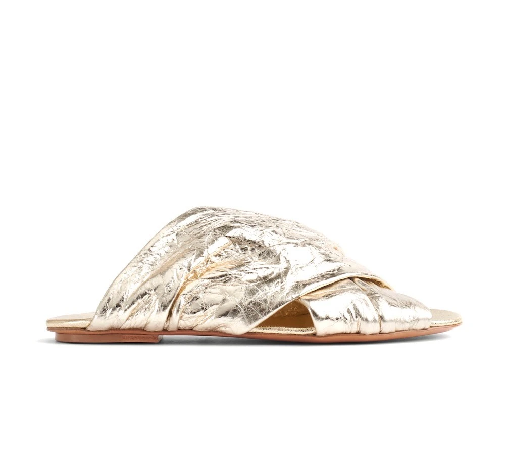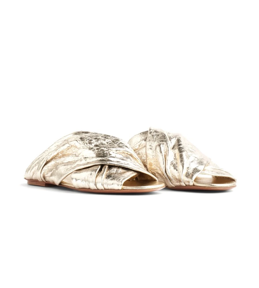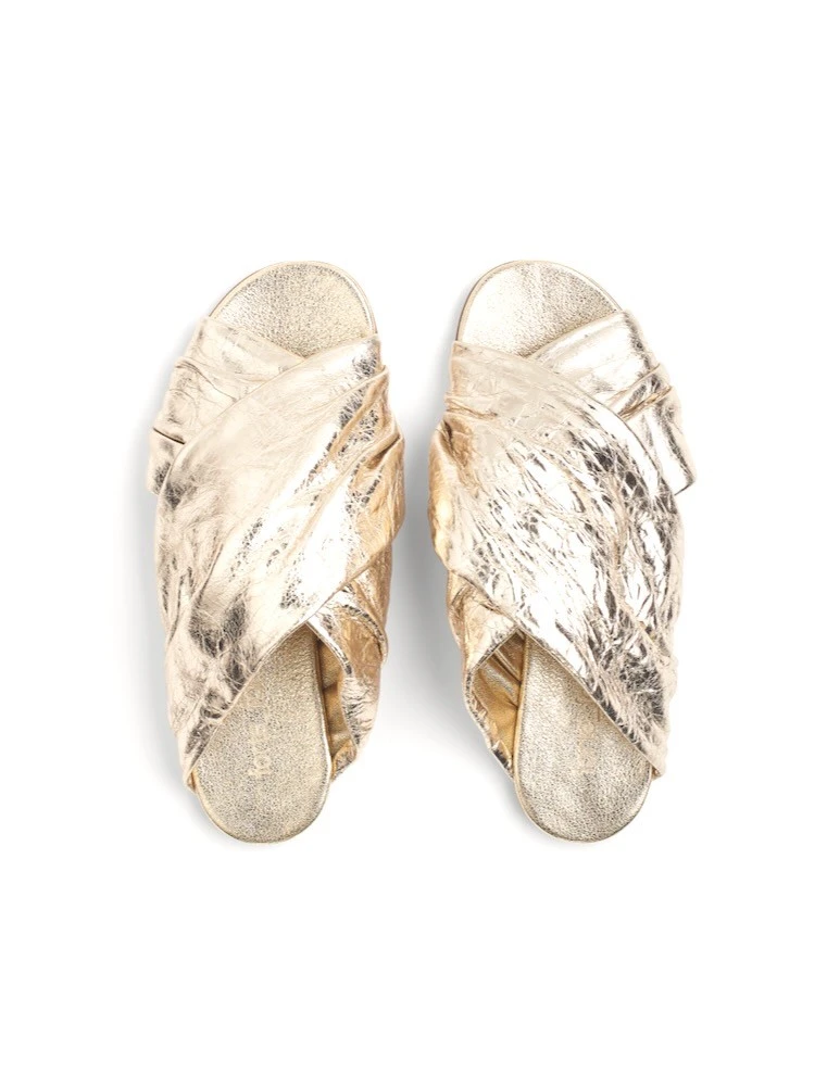 Deux très larges bandes de cuir souple croisées devant et emboitant le pied.