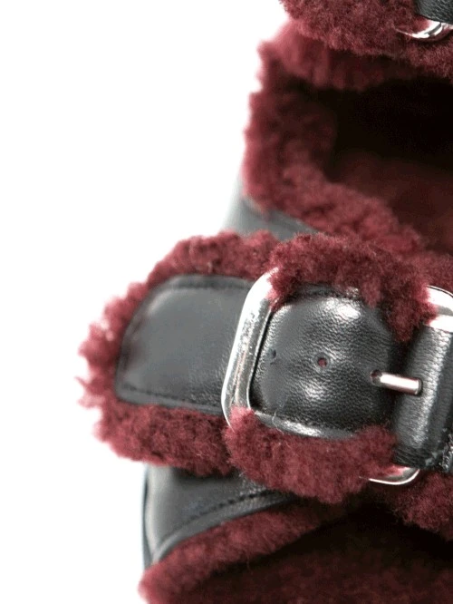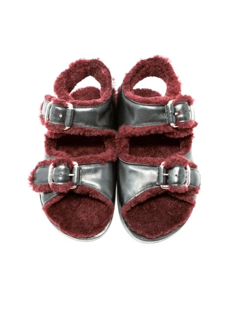 Sandales en cuir et en fourrure recyclé façon laine de mouton coloris bordeaux.