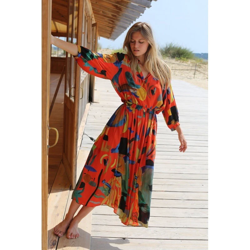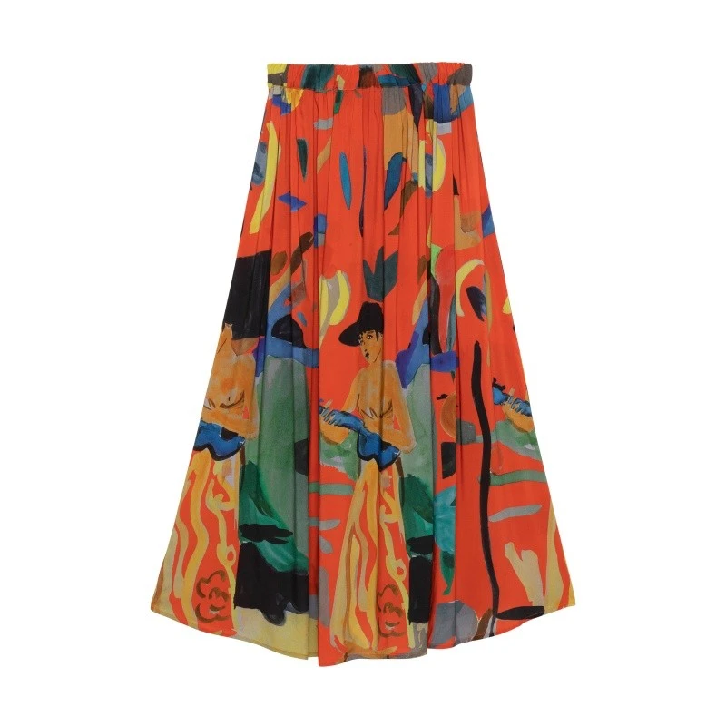 Jupe longue en viscose fluide, coupe évasée. Elle a la taille haute et élastiquée.