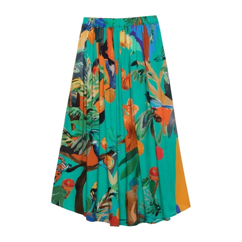 Elle est imprimée de motifs tropicaux, jungle verdoyante et fruits sur fond vert vibrant. Le nom de ce dessin est « KOH KOOD ».