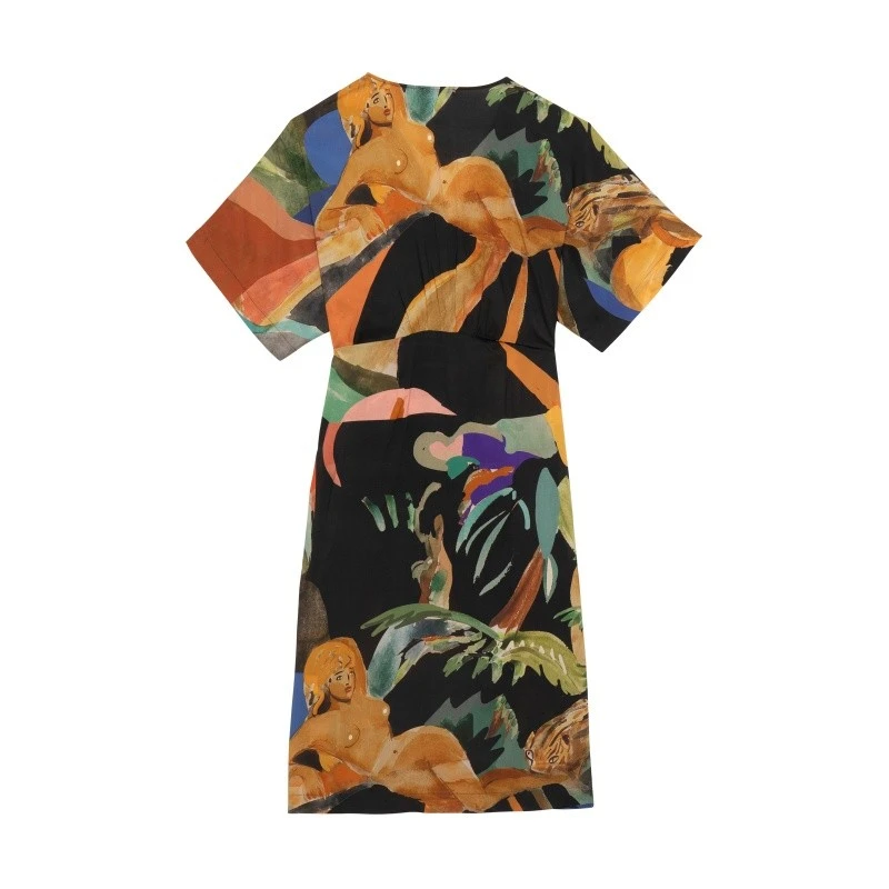 Robe mi- longue, manches courtes et larges, lien à nouer sur le côté façon cache cœur.