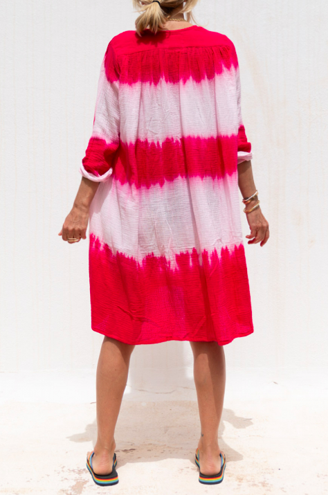 Robe en double gaze, 100 % coton, tie and dye artisanal réalisé à la main, très léger, effet froissé.