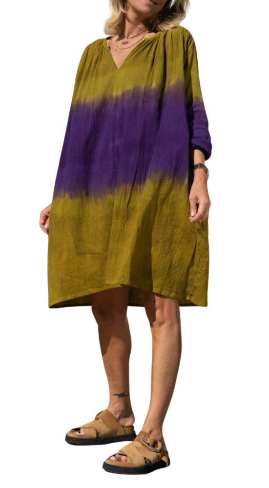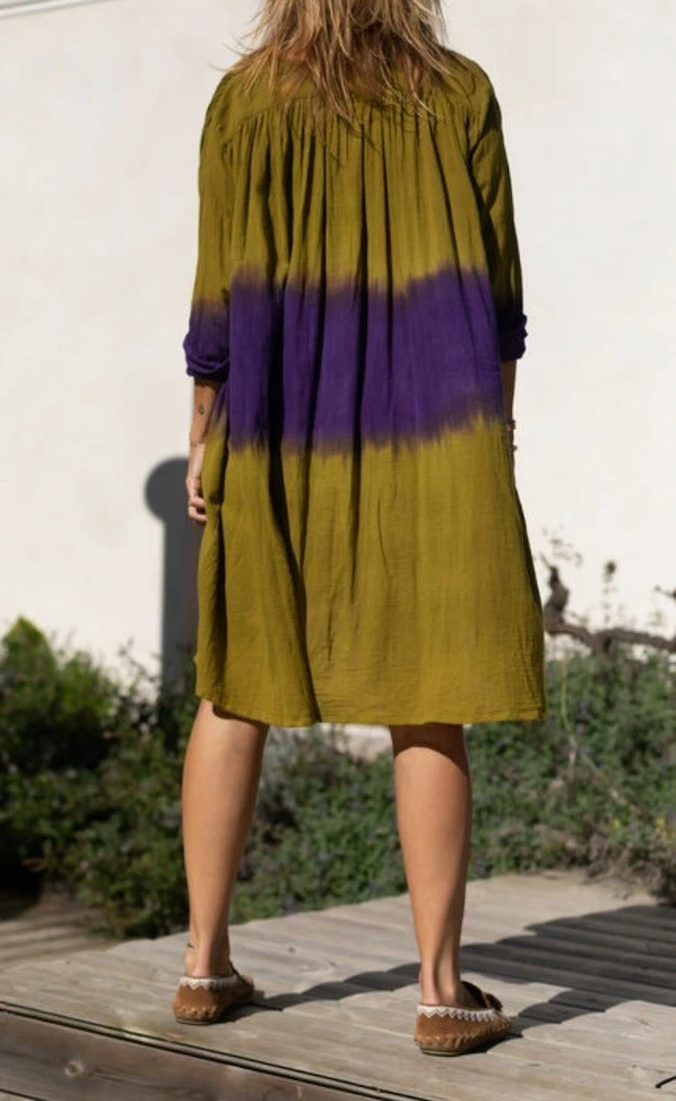 Robe en double gaze, 100 % coton, tie and dye artisanal réalisé à la main, très léger, effet froissé.