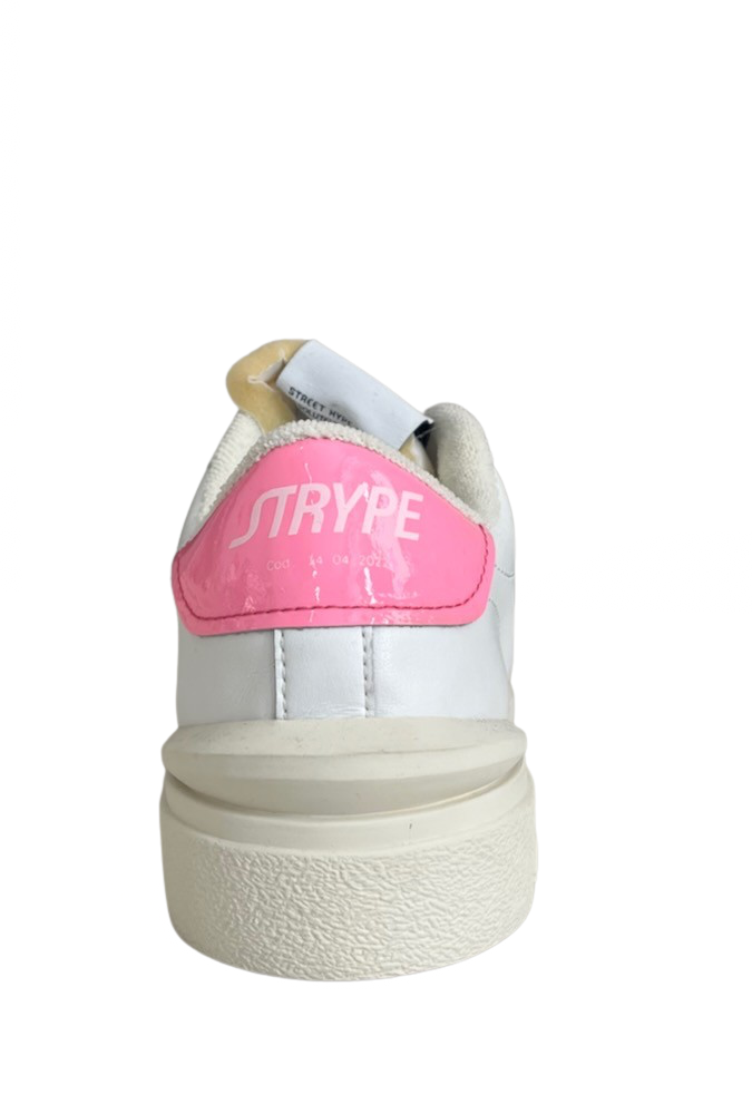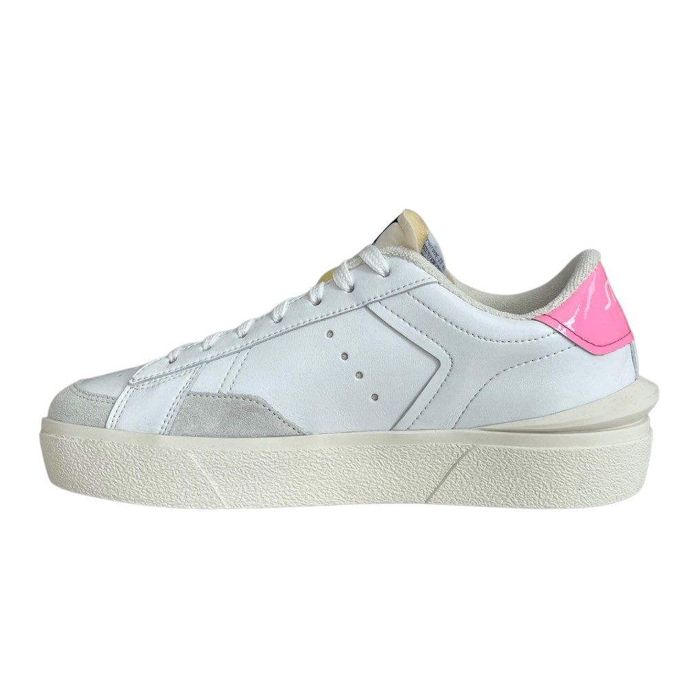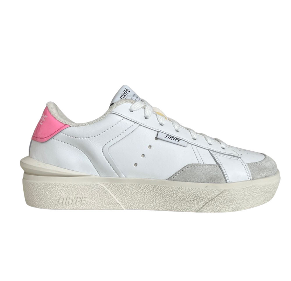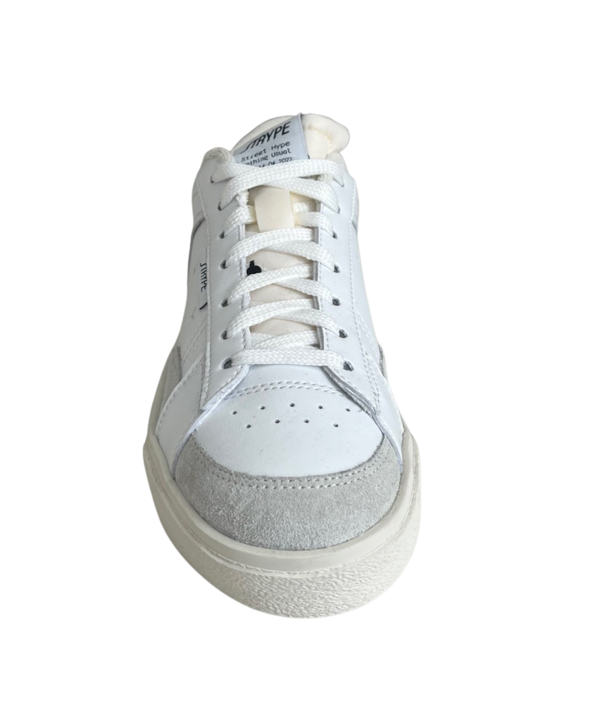 En cuir lisse blanc et empiècement en cuir suède blanc cassé à l’avant.