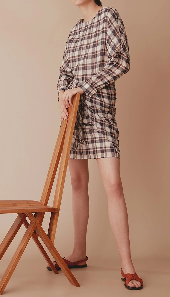 Lanis Robe Valentine Gauthier Robe courte bleu à carreaux en voile de coton légèrement gaufré. Col rond et manches longues raglans ornées d’un bouton en nacre. Noeud autour de la taille. Fermeture par zip invisible.